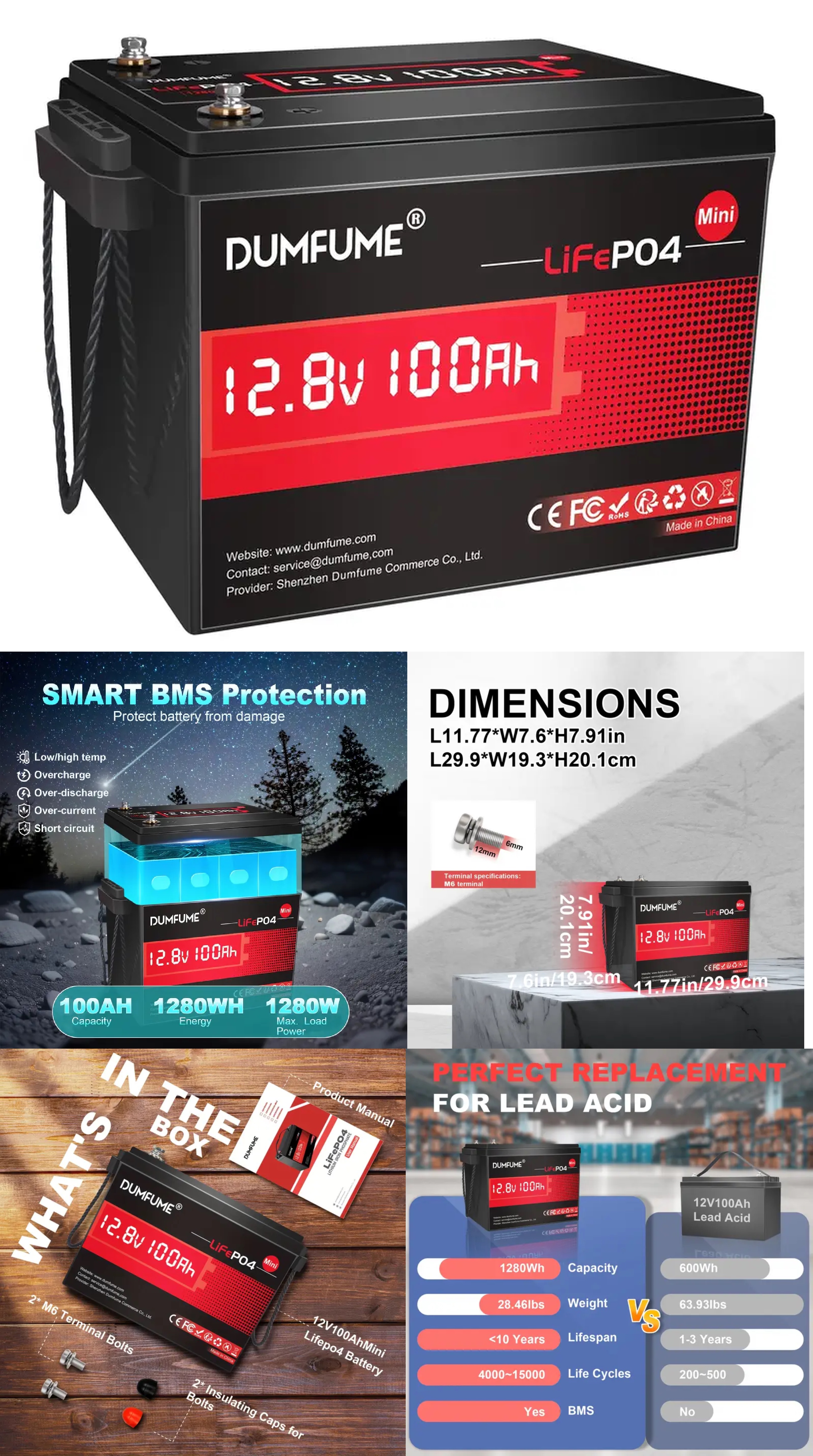 New! 12V 100Ah Mini LiFePO4 Lithium Battery, Built-in 100A BMS,1280Wh Deep Cycle Rechargeable Battery 6000+ Cycles 10-Year Lifespan for RV, Solar, Marine and Home Energy Storage.